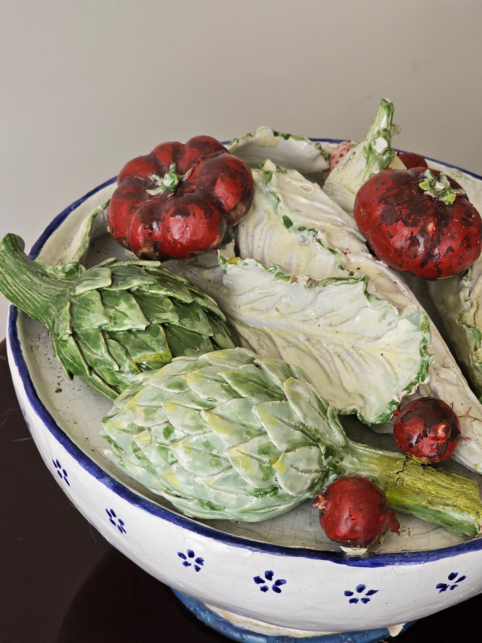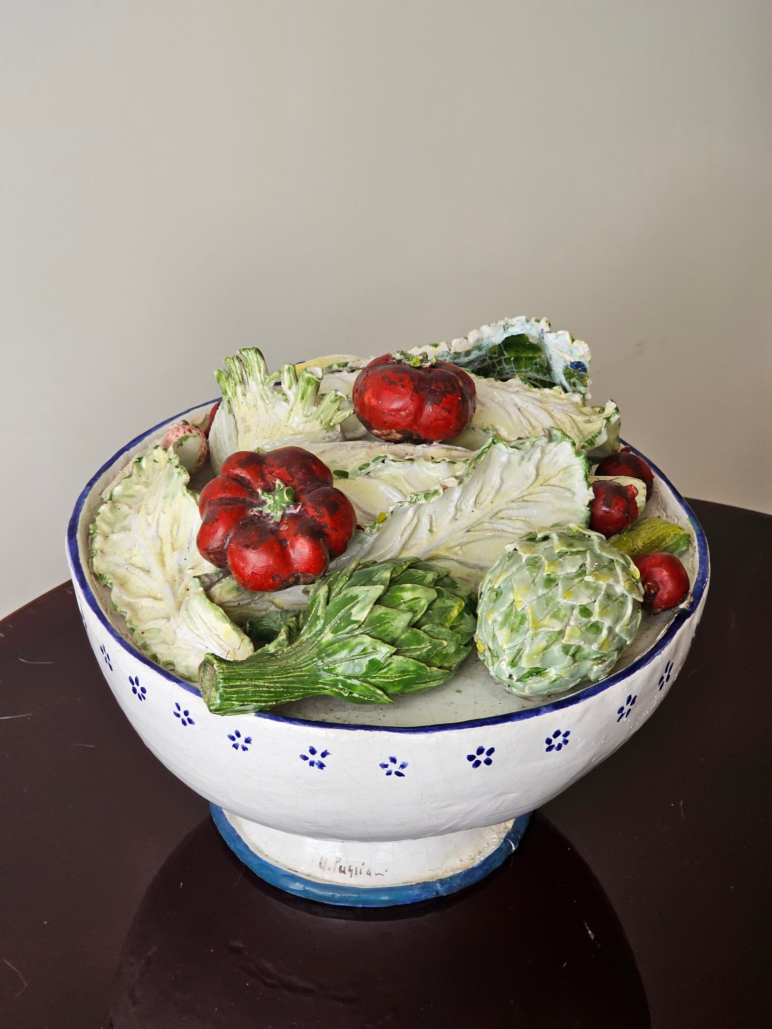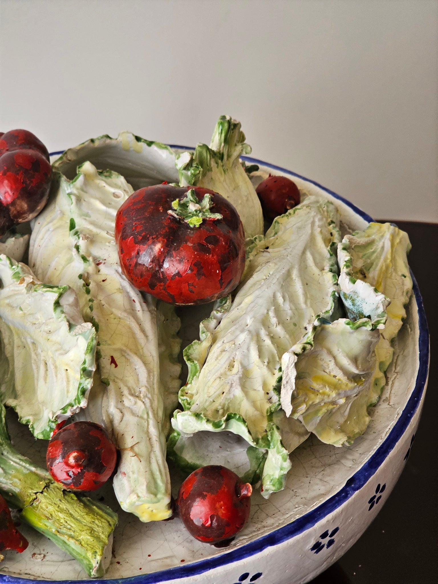 L'autore ha voluto replicare una grande insalatiera piena di verdure con una decorazione molto realistica.