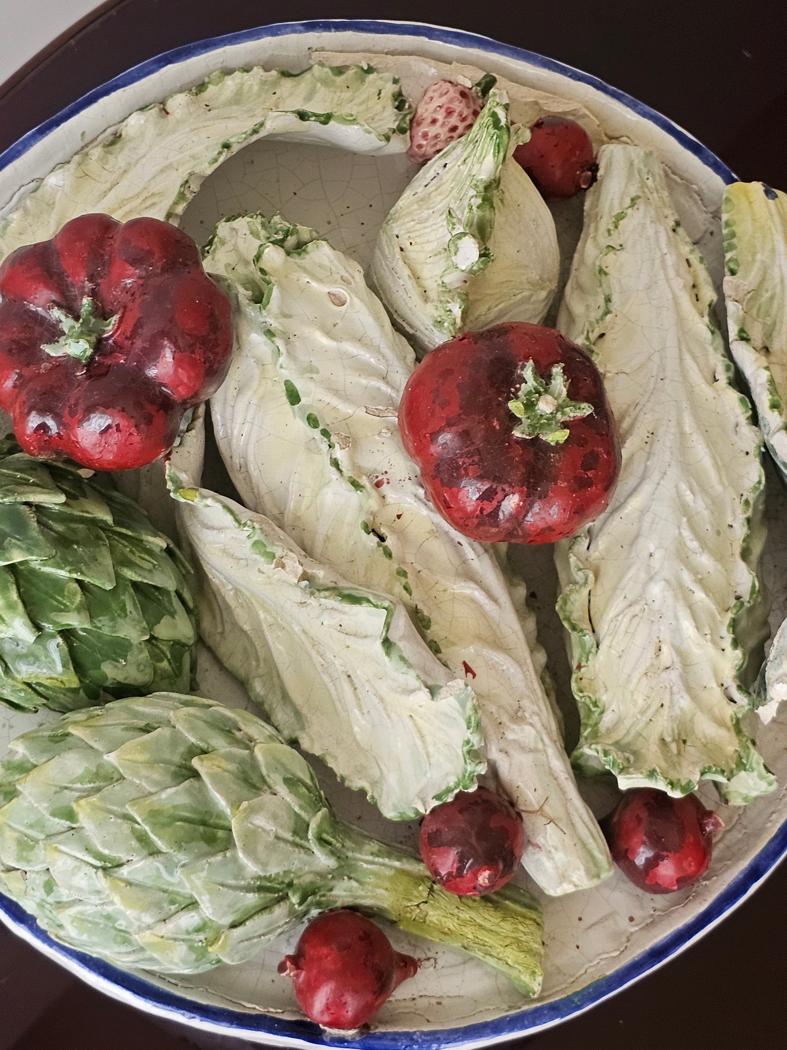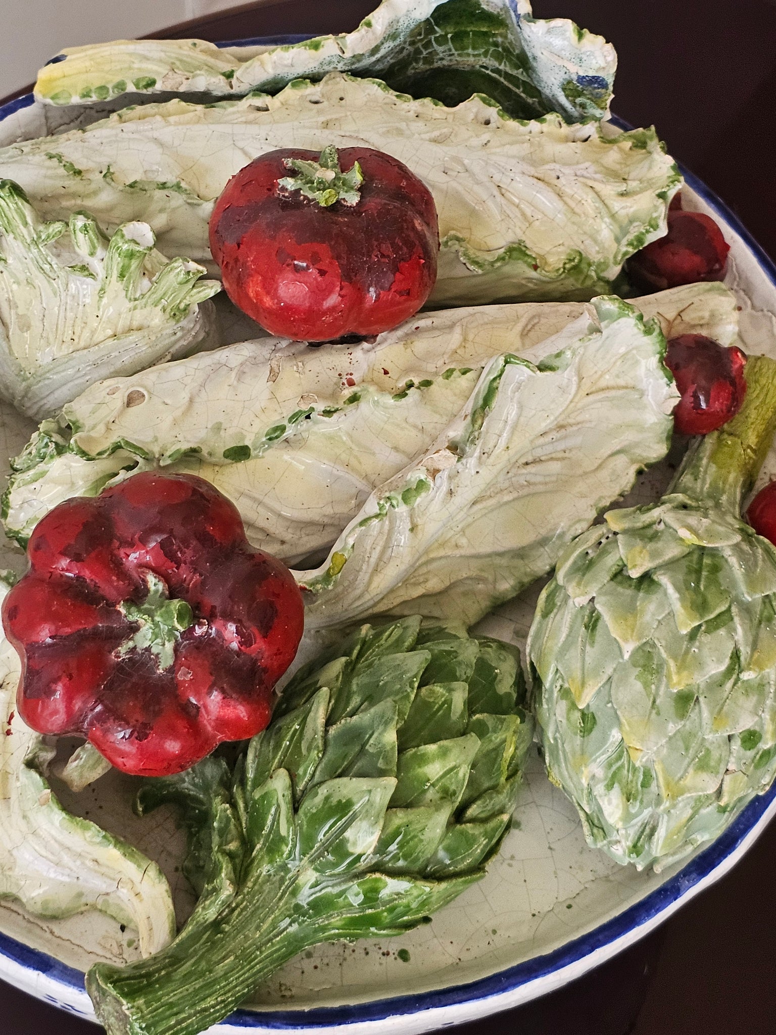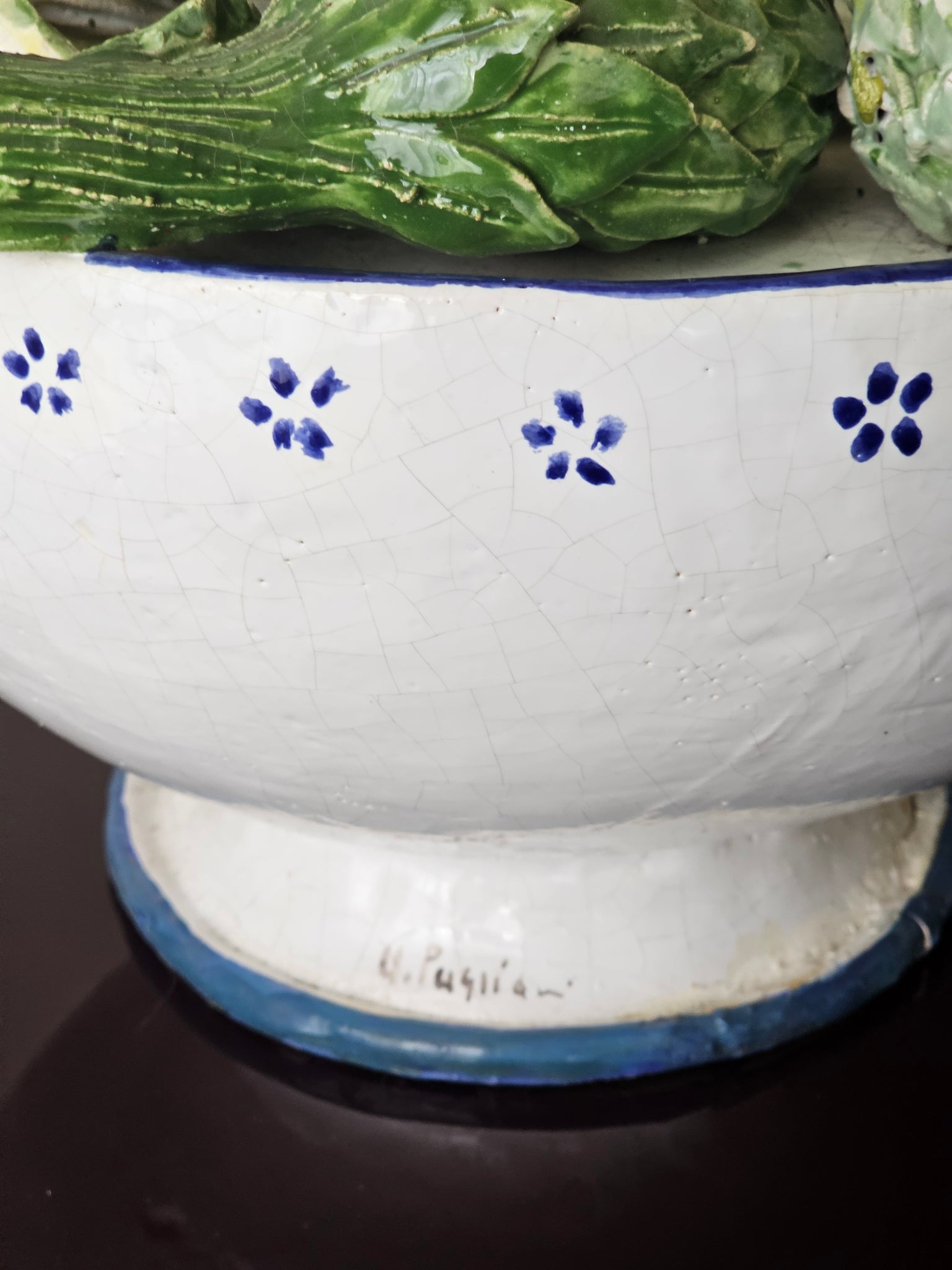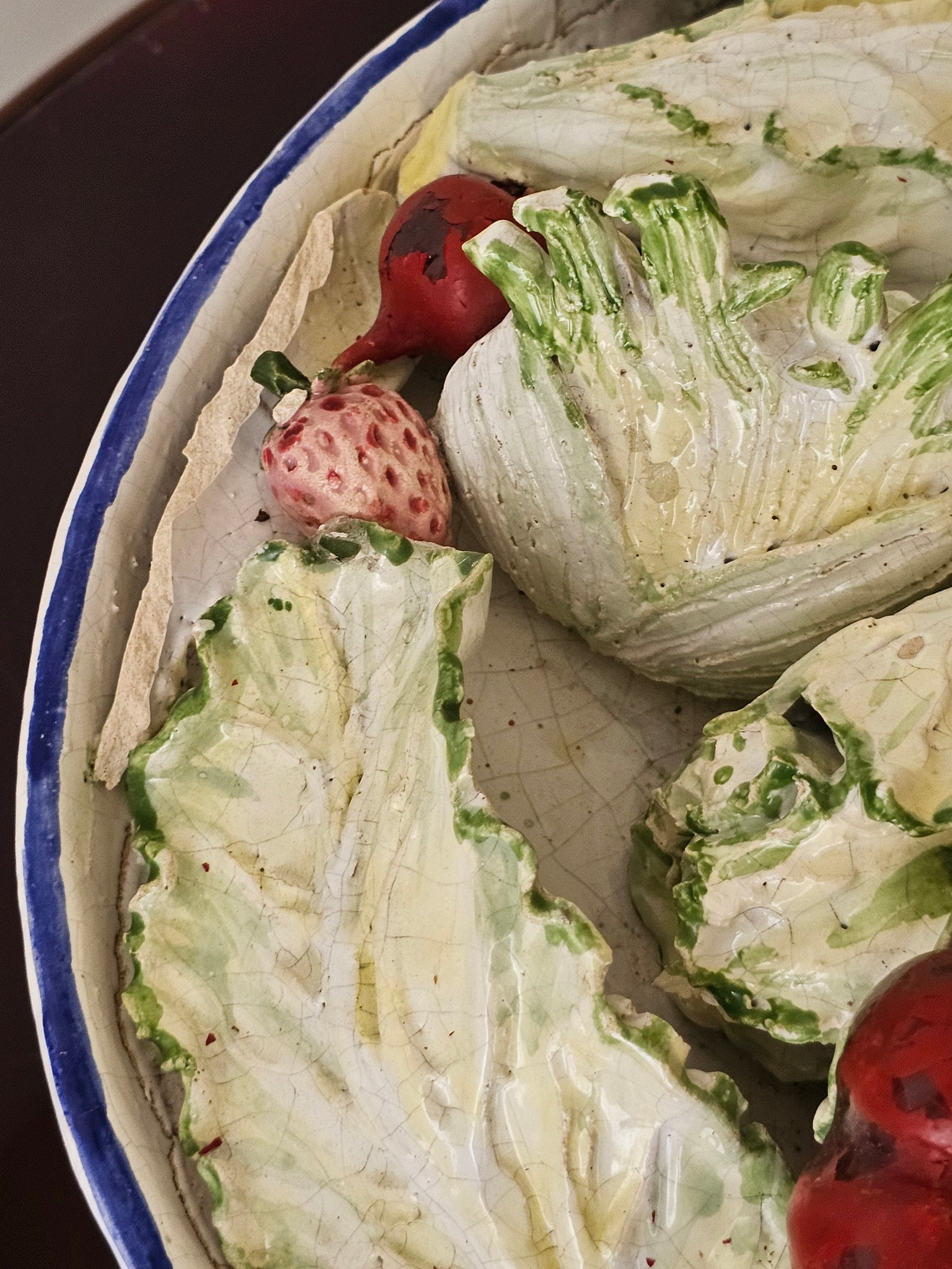 L'autore ha voluto replicare una grande insalatiera piena di verdure con una decorazione molto realistica.