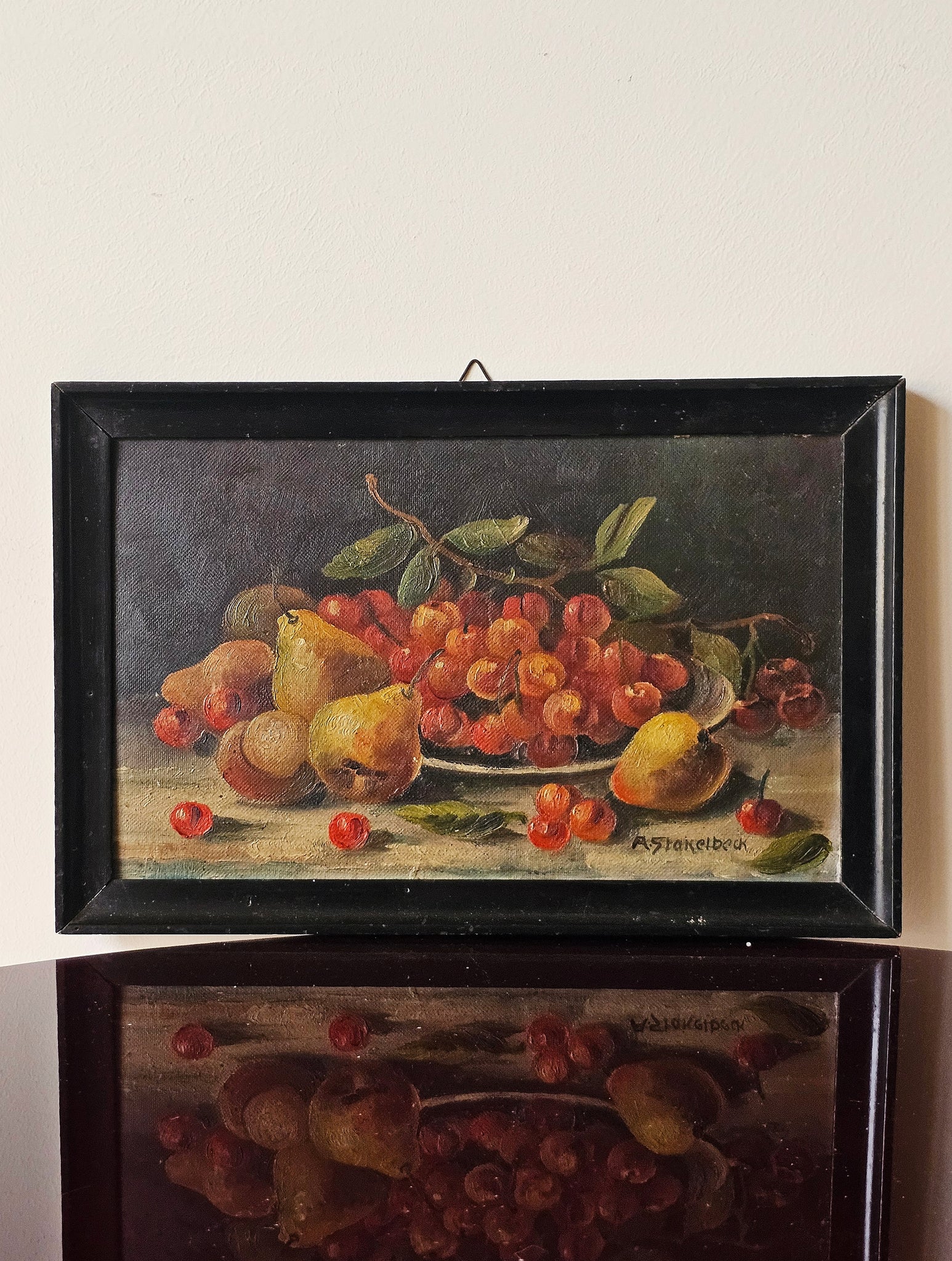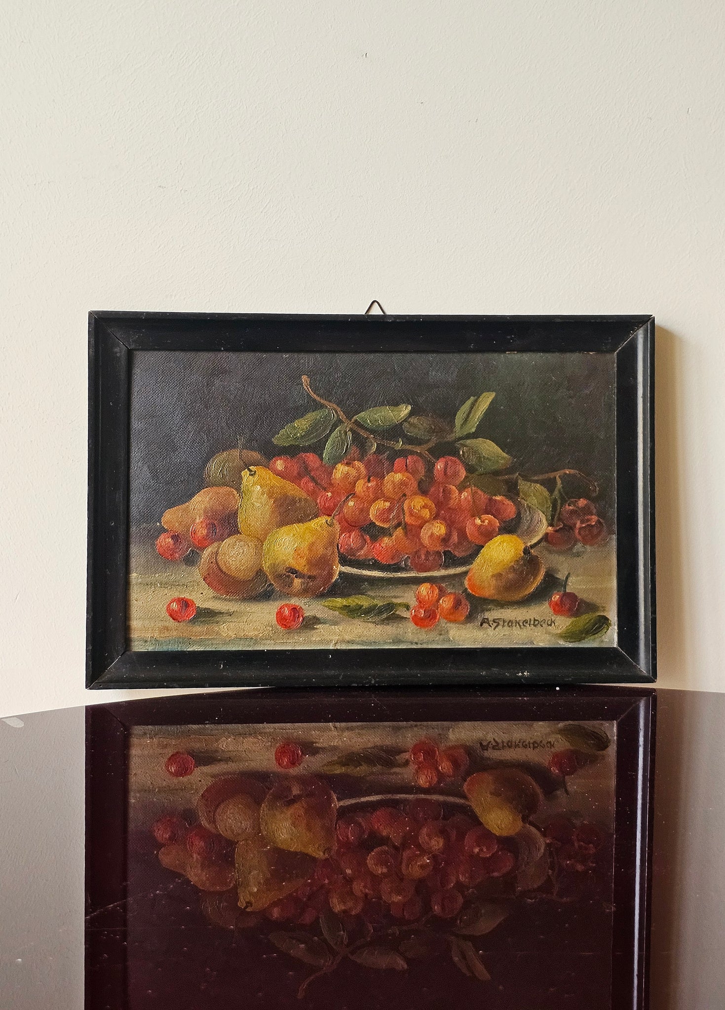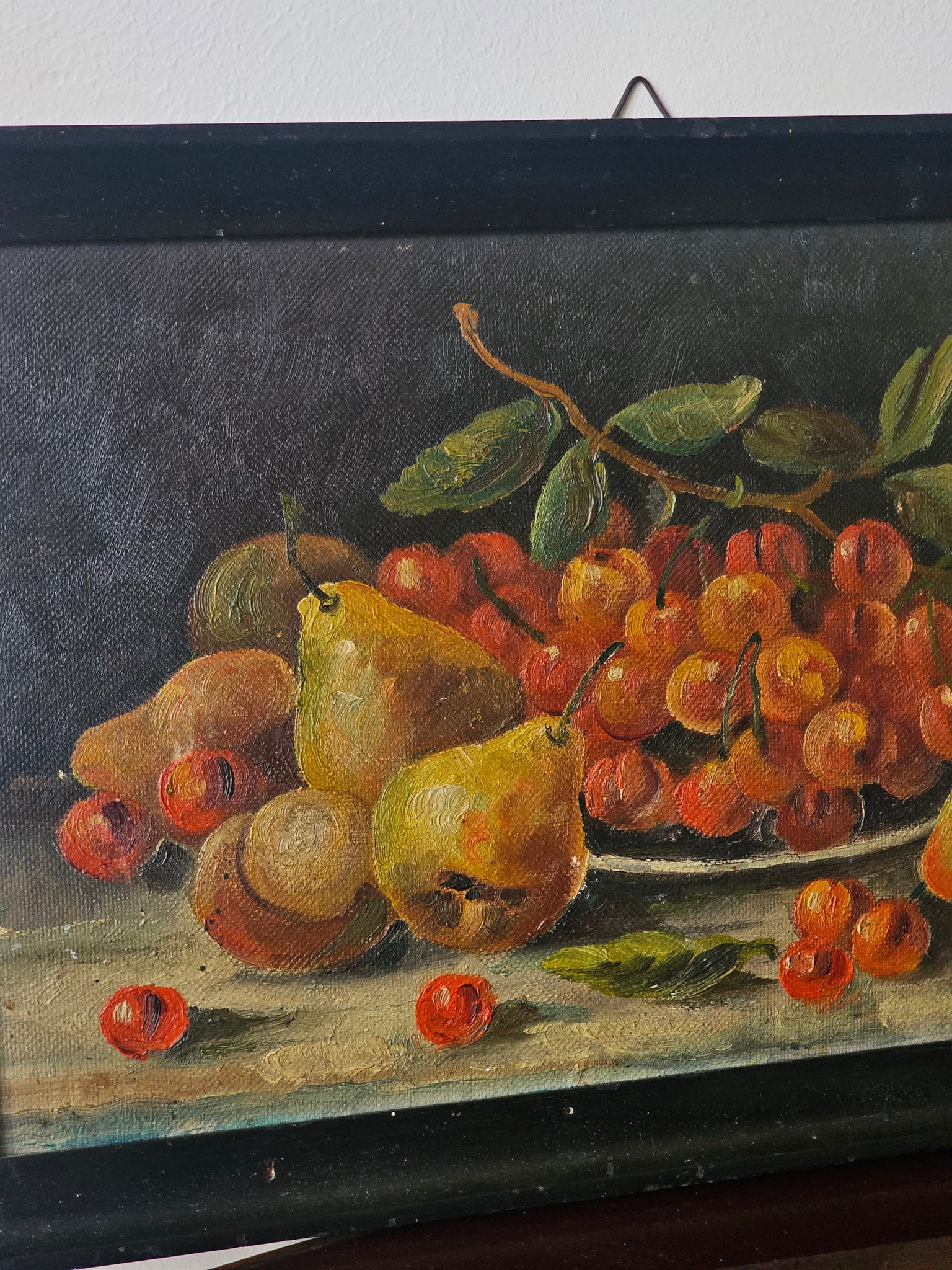 Elegante natura morta a tema ciliegie e pere, delicata e con sviluppo orizzintale.