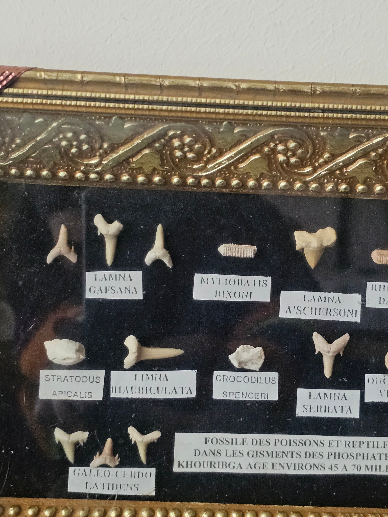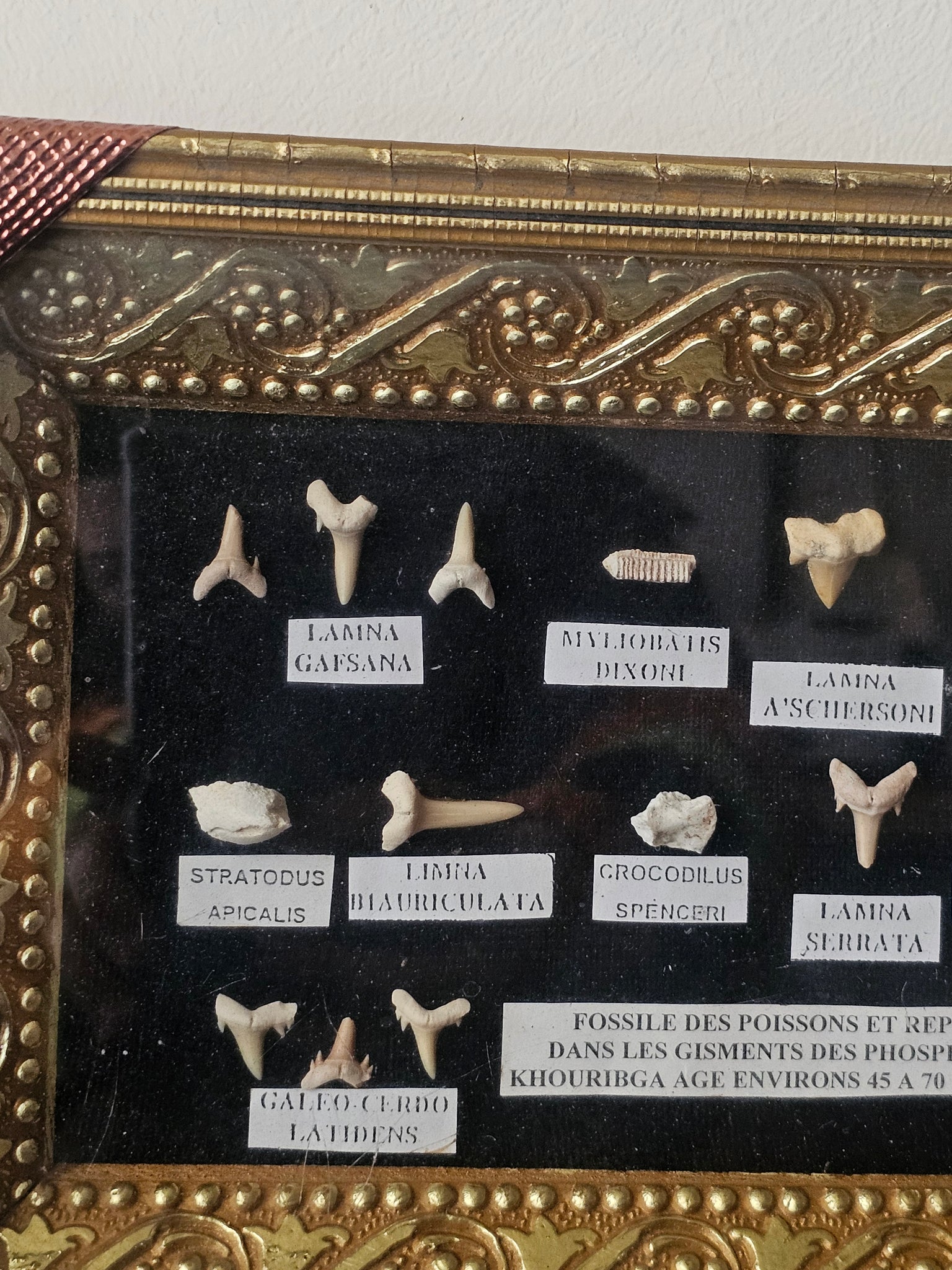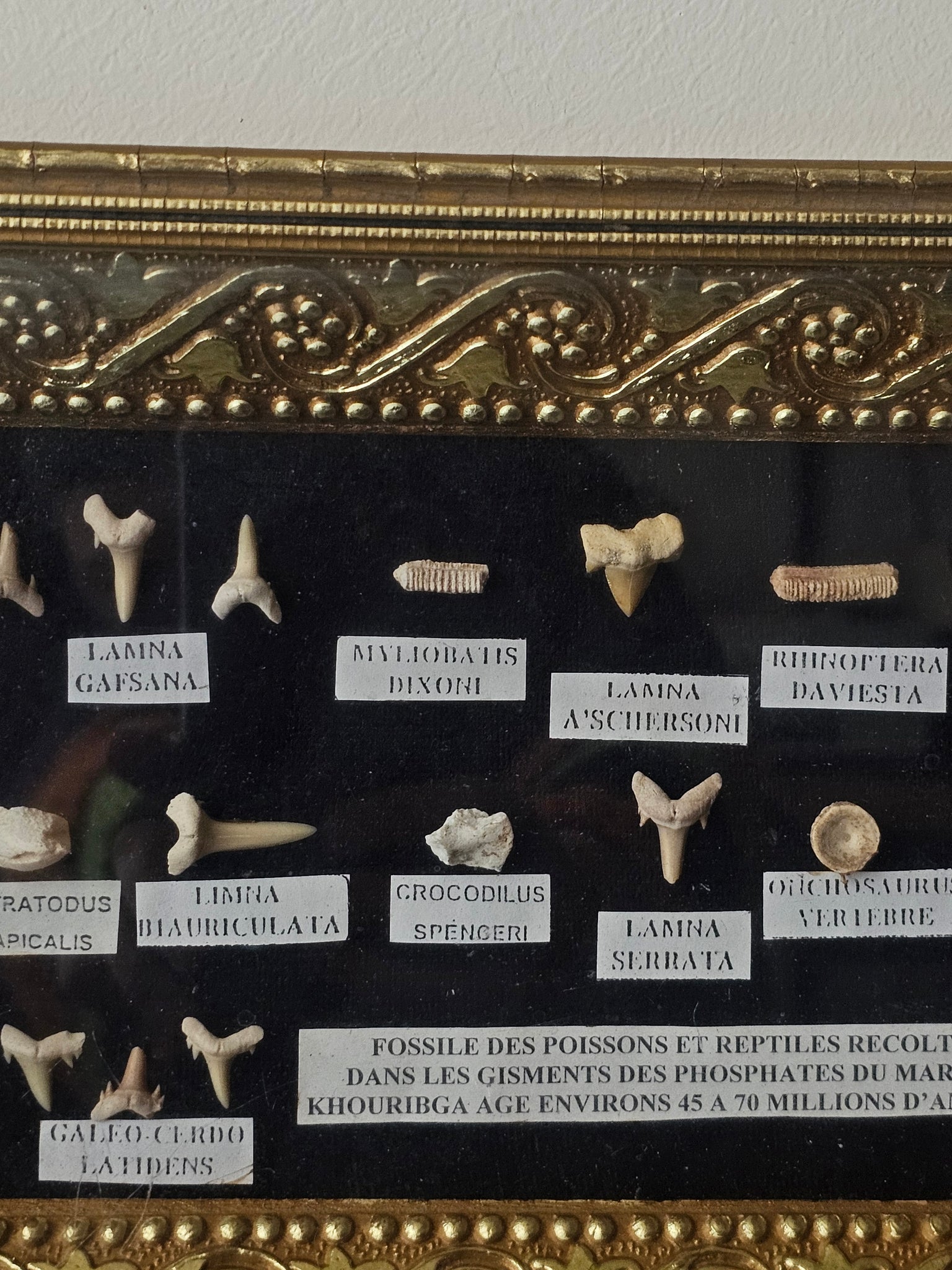 Denti fossili di pesci e rettili recuperati dai giacimenti di fosfati di Khouribga, in Marocco, risalenti a circa 45-70 milioni di anni fa.