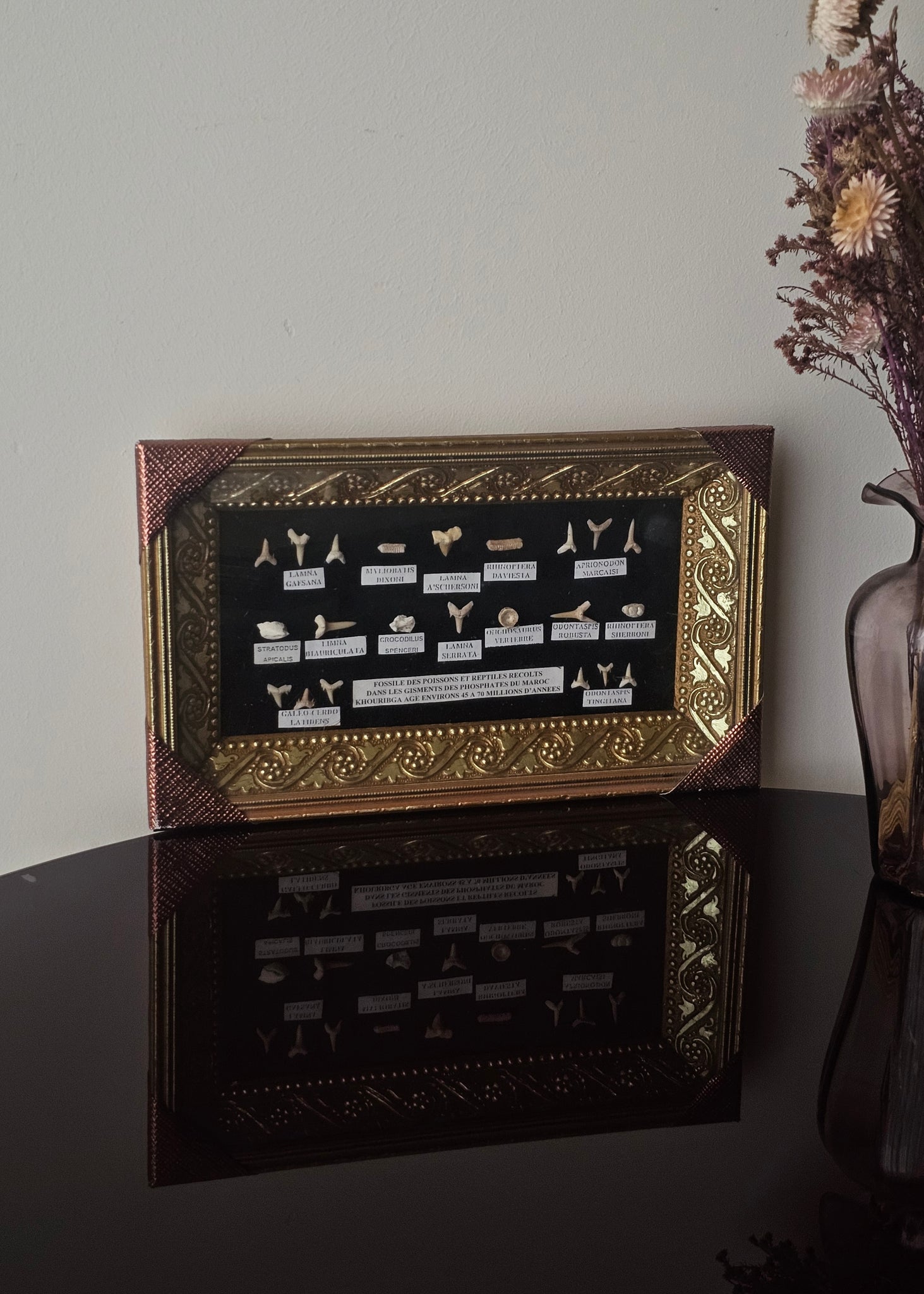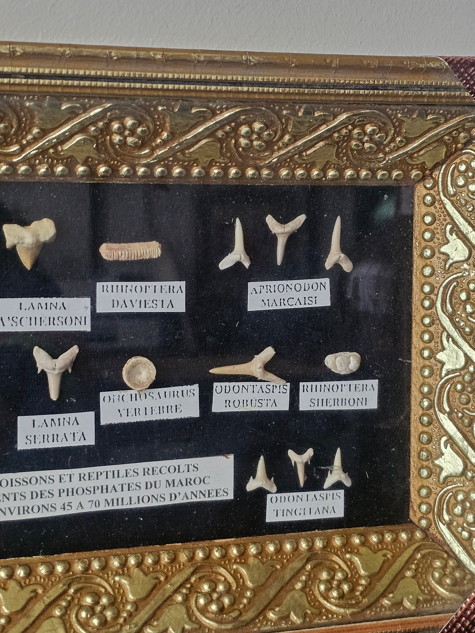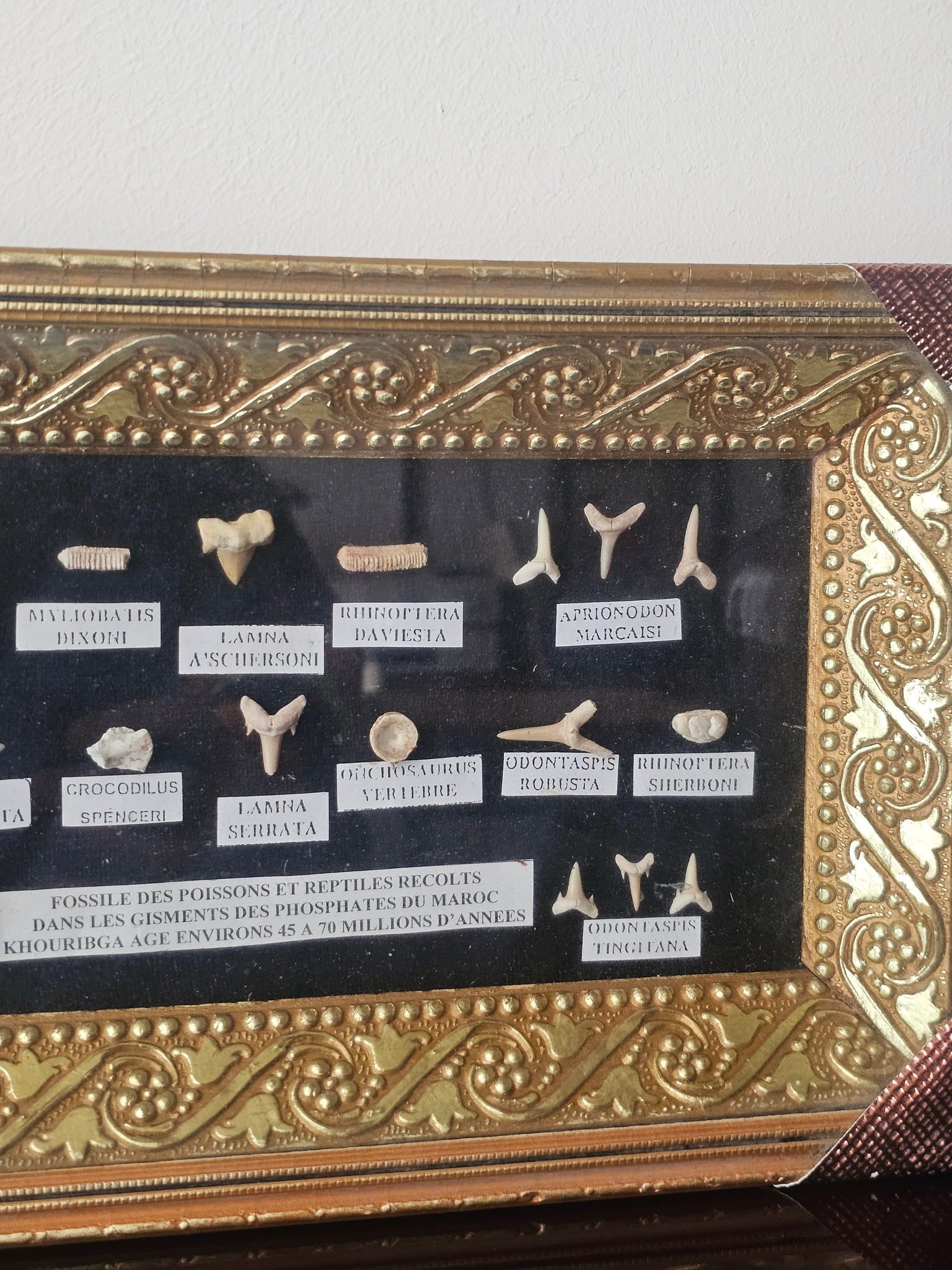 Denti fossili di pesci e rettili recuperati dai giacimenti di fosfati di Khouribga, in Marocco, risalenti a circa 45-70 milioni di anni fa.