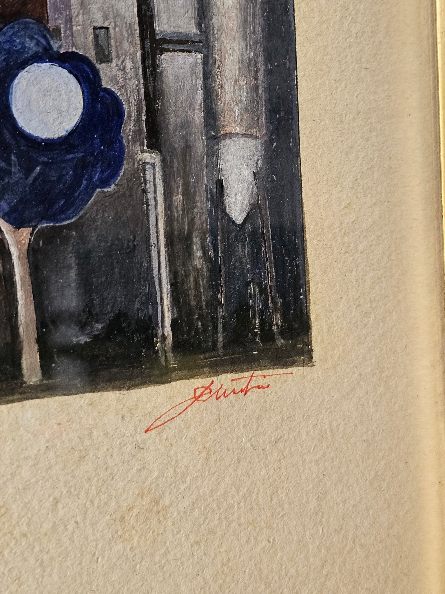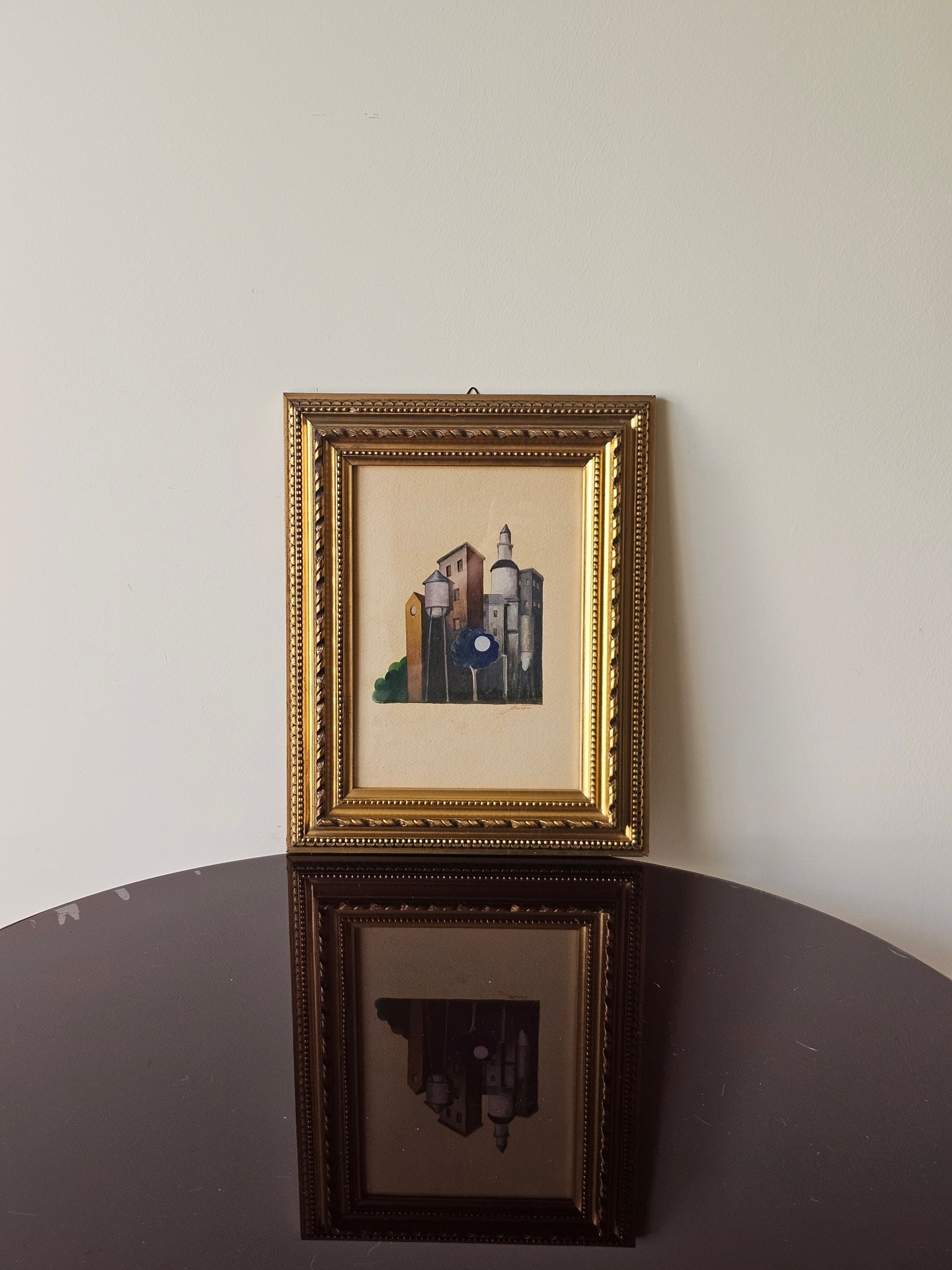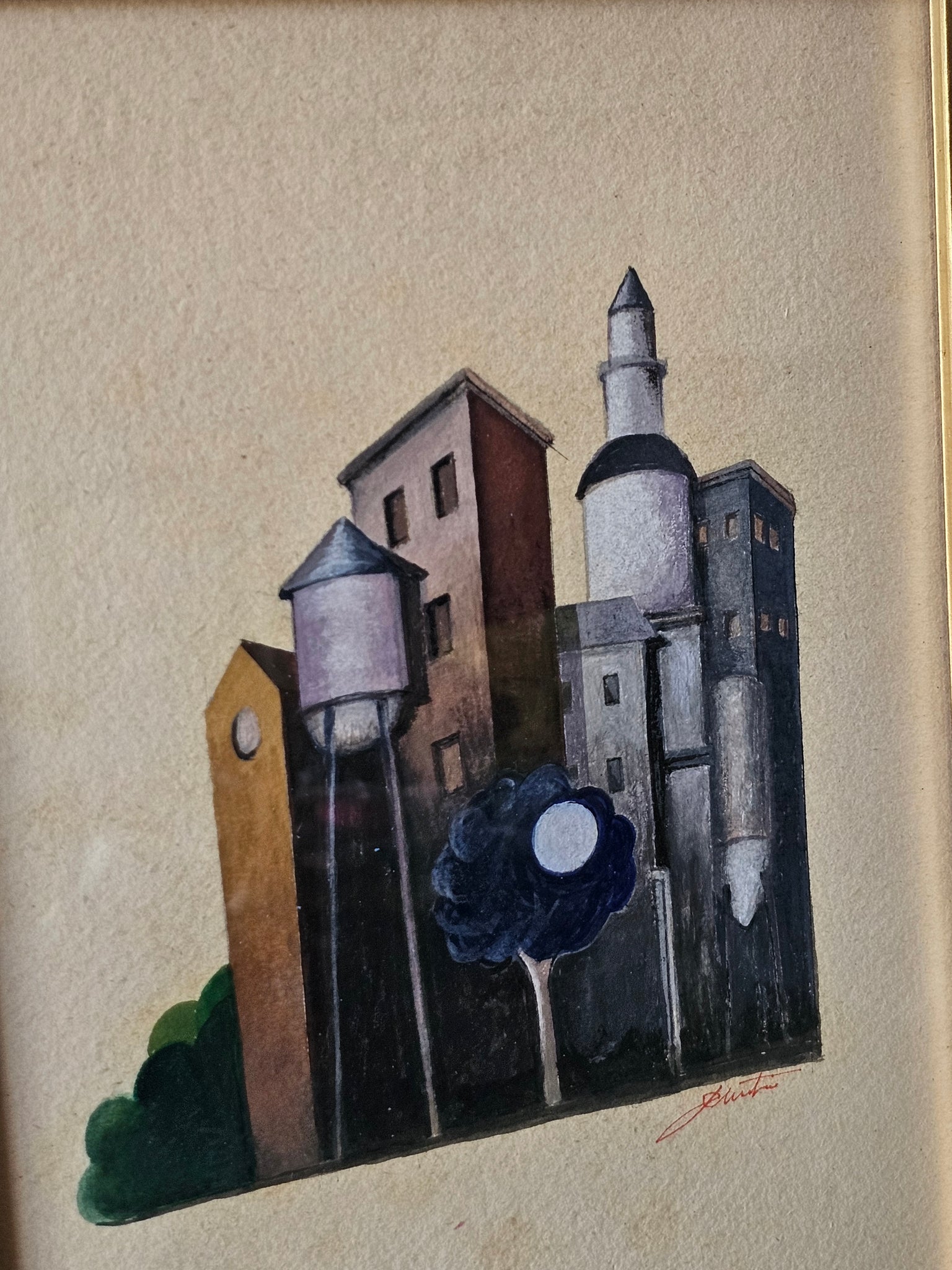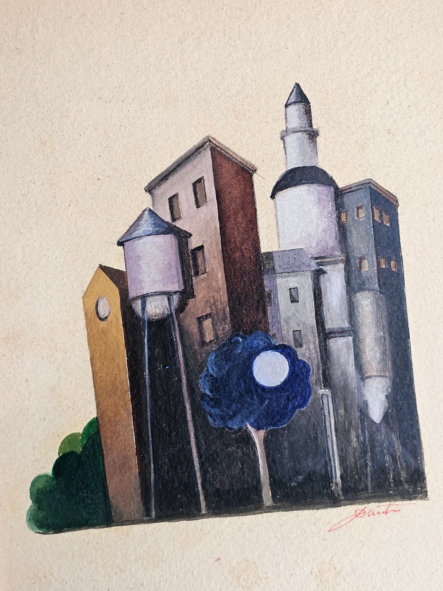 Meraviglioso quadro con paesaggio industriale di fabbricati e container.