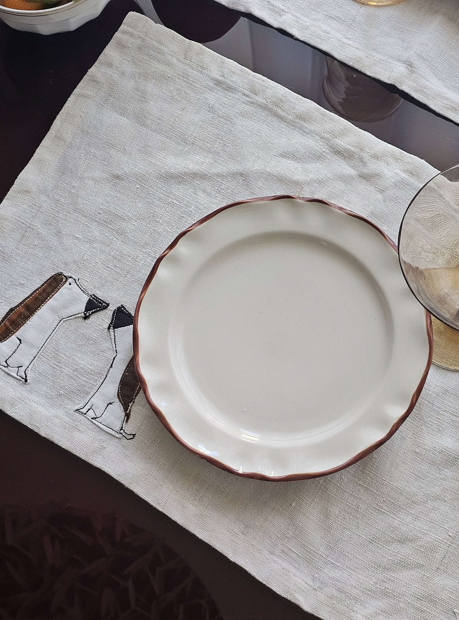 - tovagliette con tessuto di lino grezzo e applicazione di cagnolino.