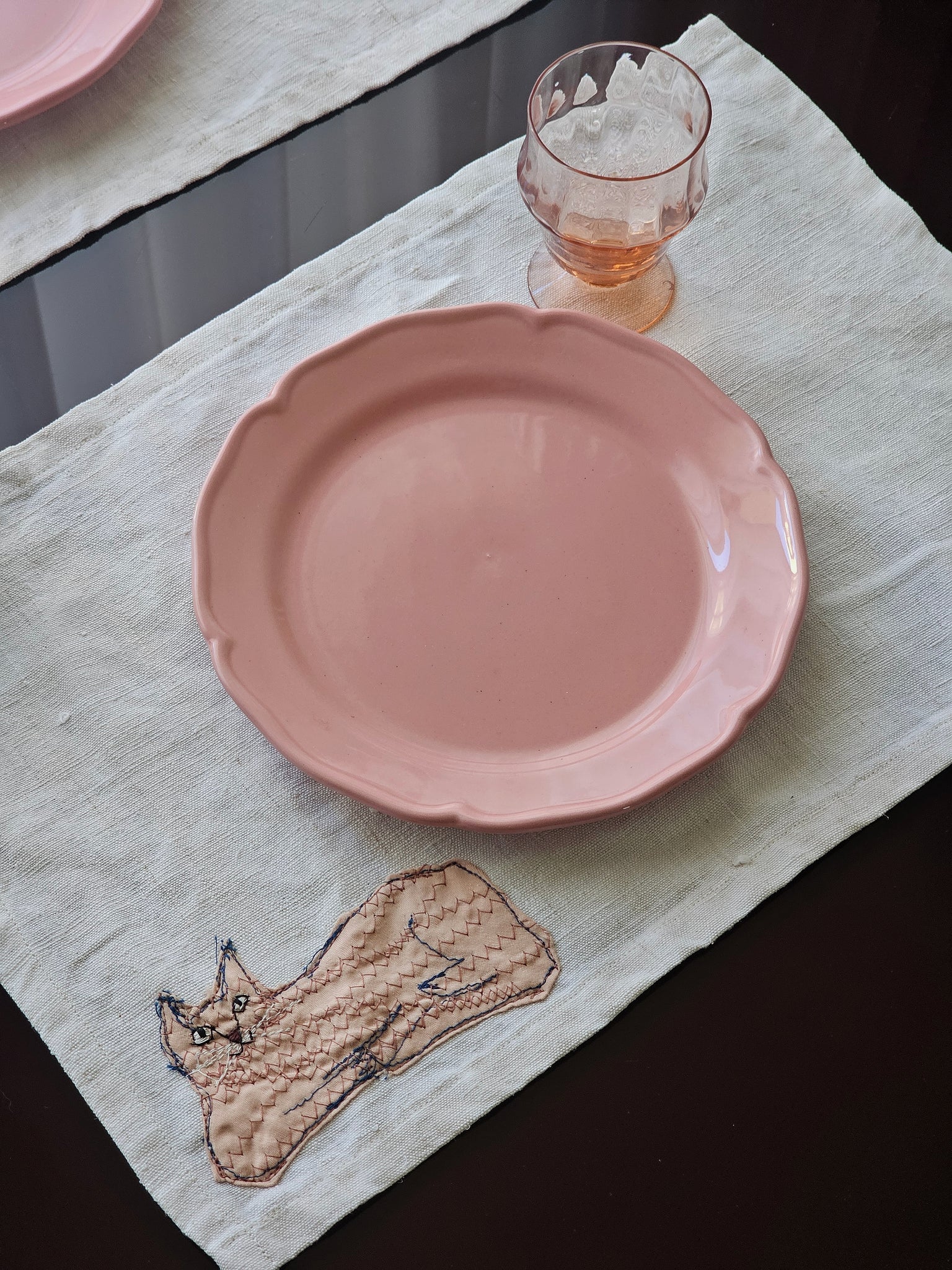 - tovagliette con tessuto in lino grezzo e applicazione di gattino nei toni del rosa salmone;