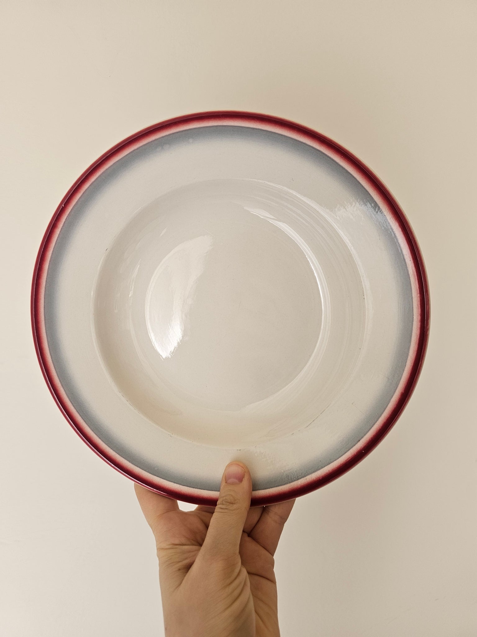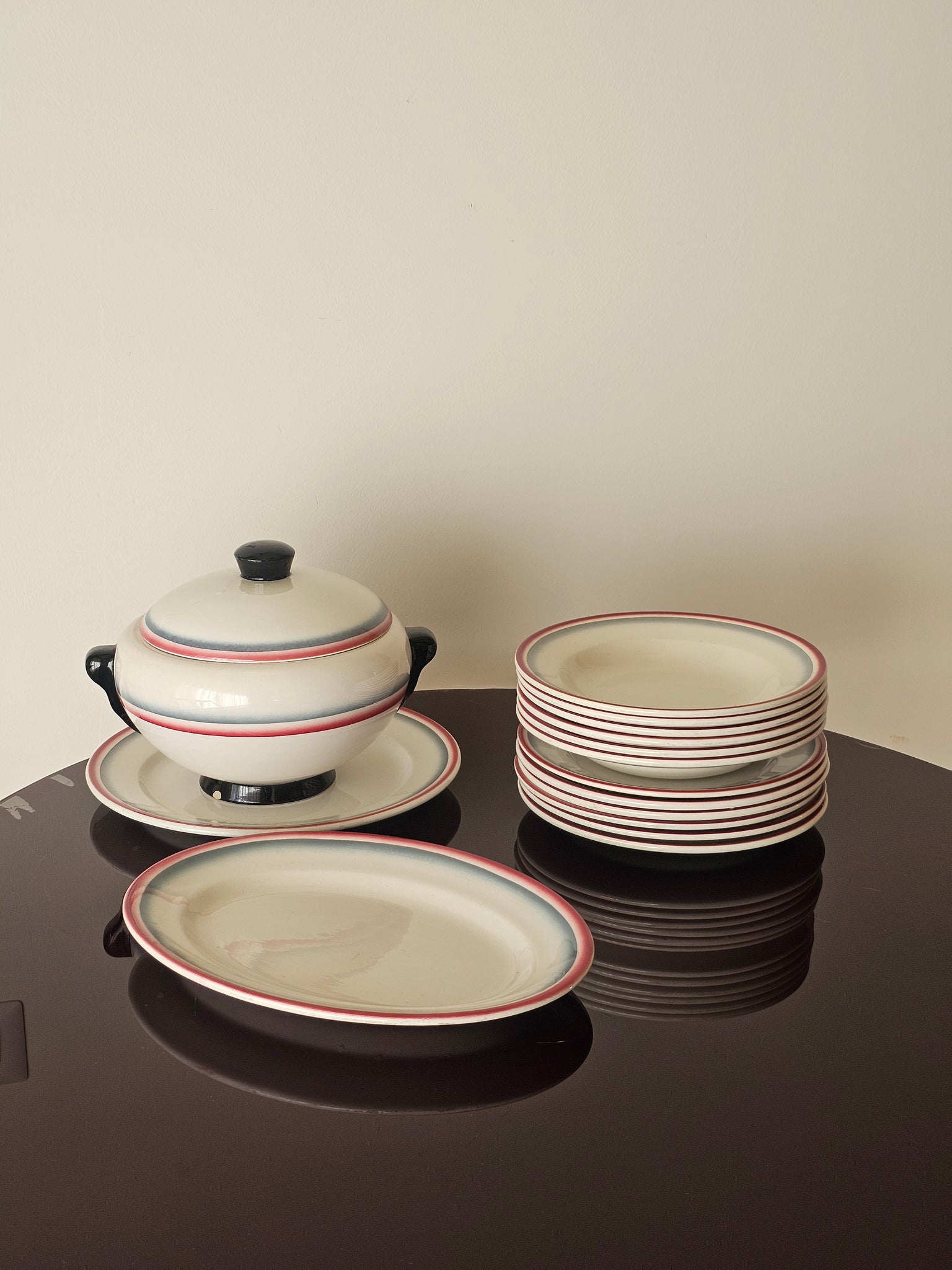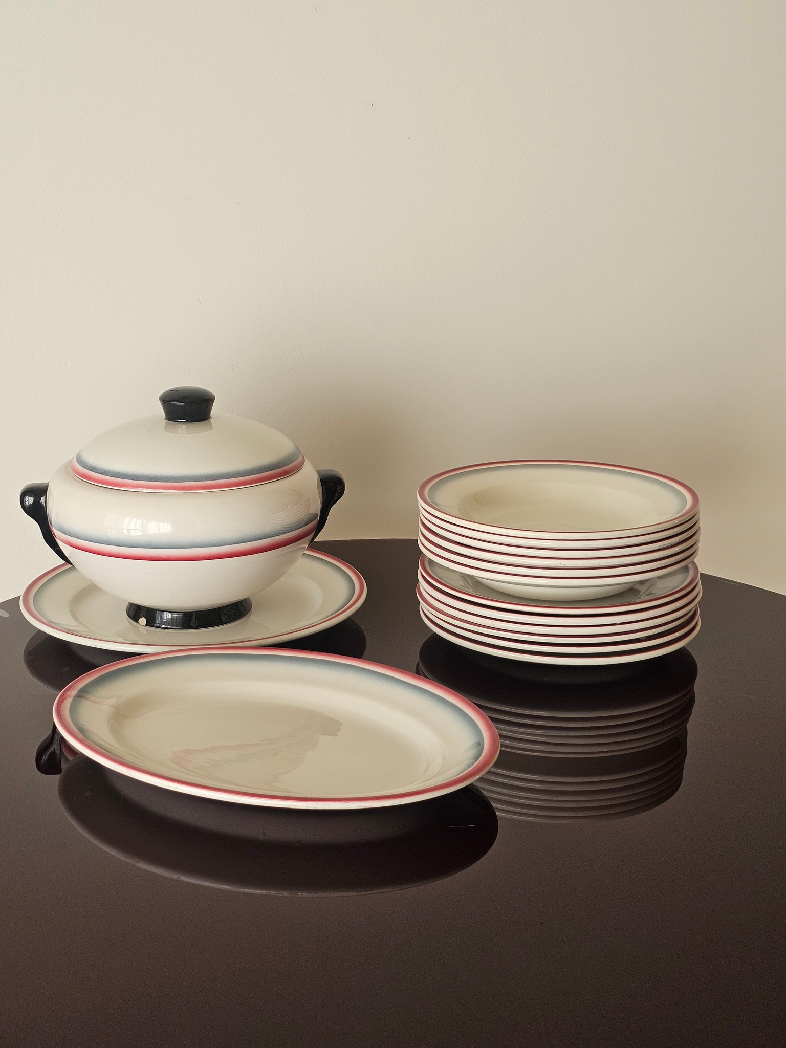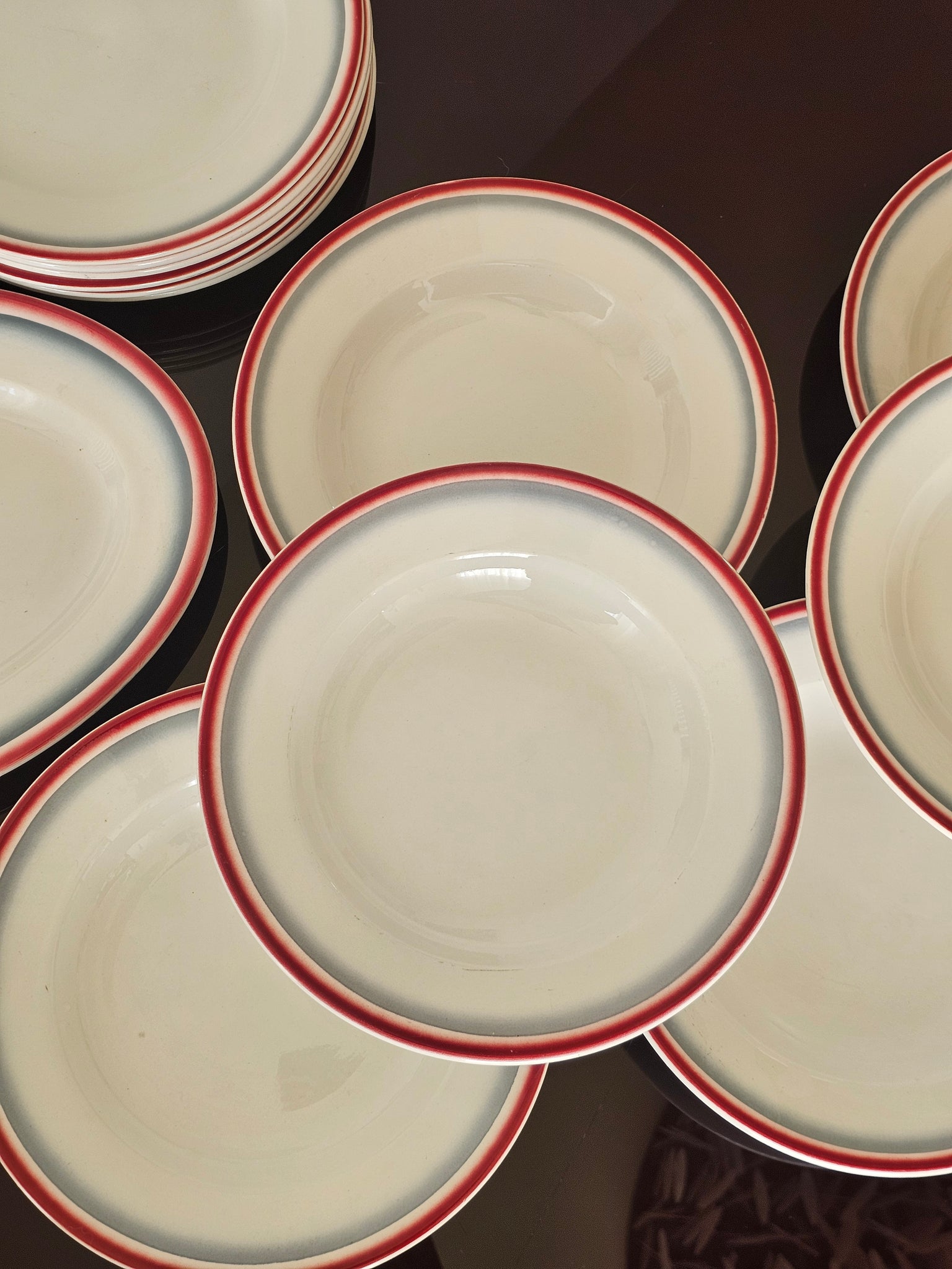 Servizio di piatti realizzato con decoro ad aerografo nei toni del grigio e del rosso ciliegia del marchio storico Galvani Pordenone.